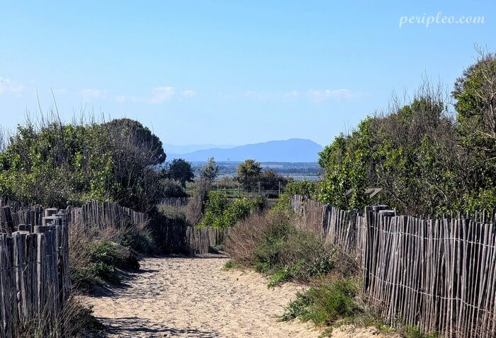 L’accès au Petit Travers se fait par des chemins aménagés traversant les dunes qui séparent la route de la plage.